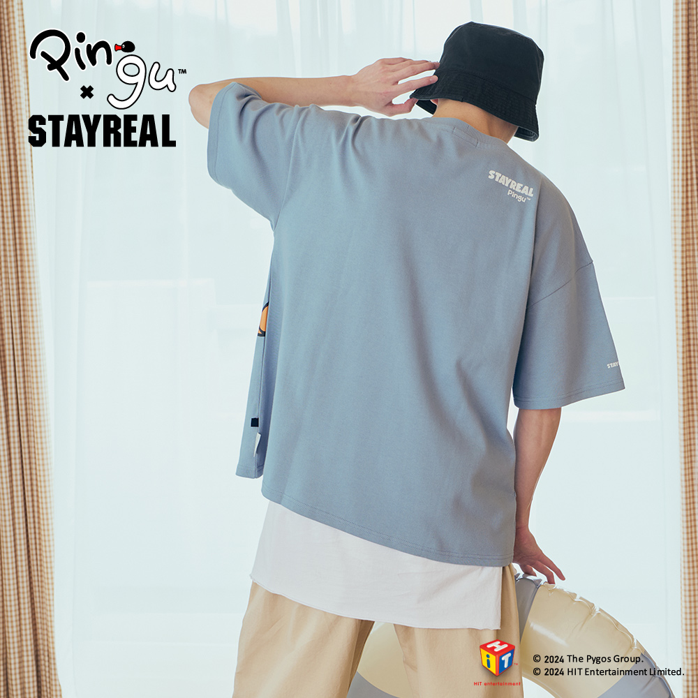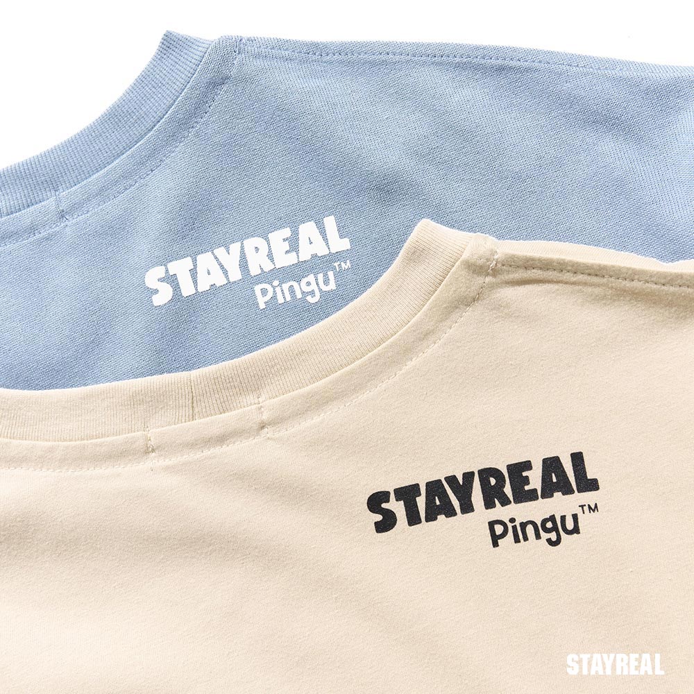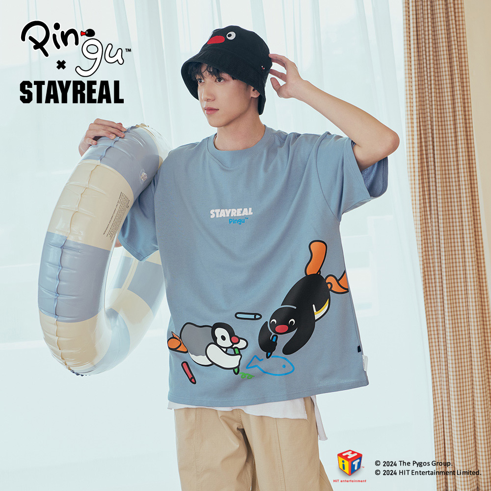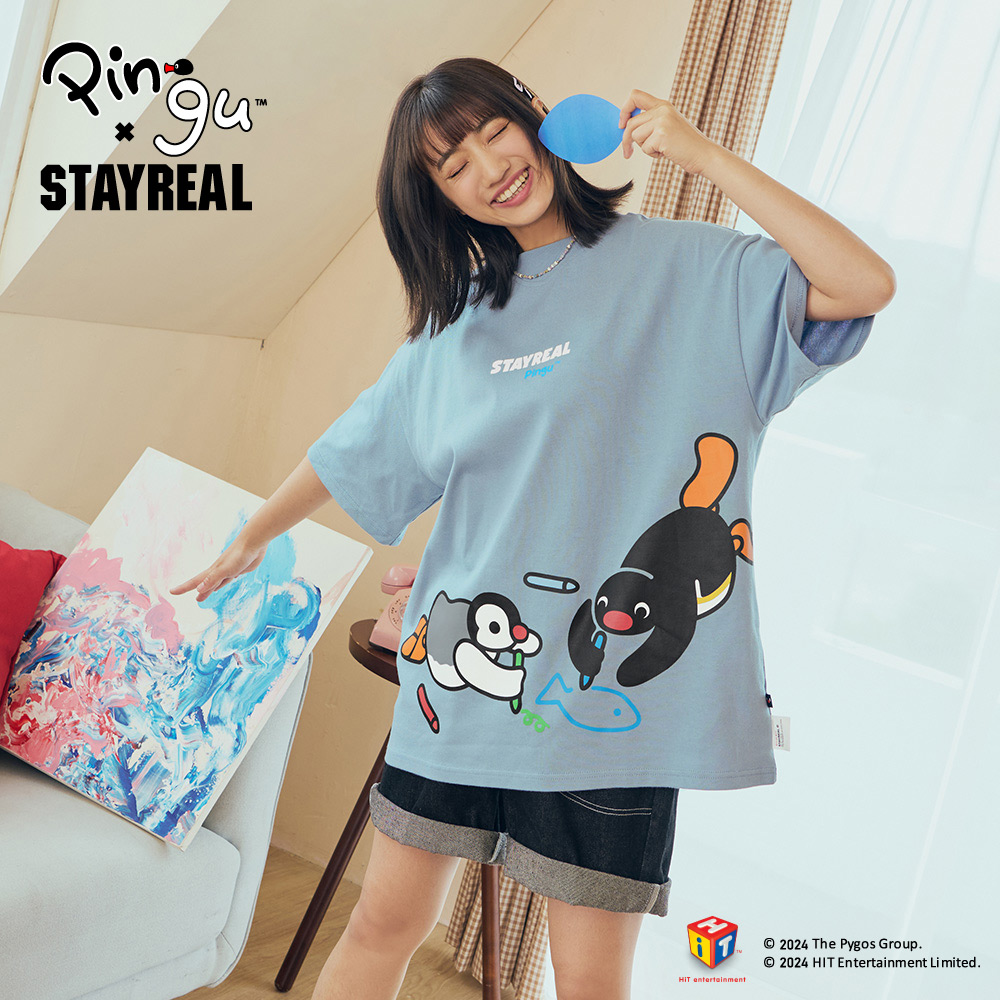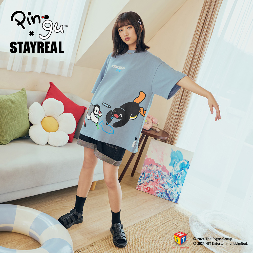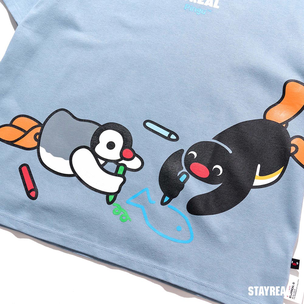 STAYREAL x 企鵝家族 Pingu 哥哥妹妹塗鴉寬版T - 灰藍