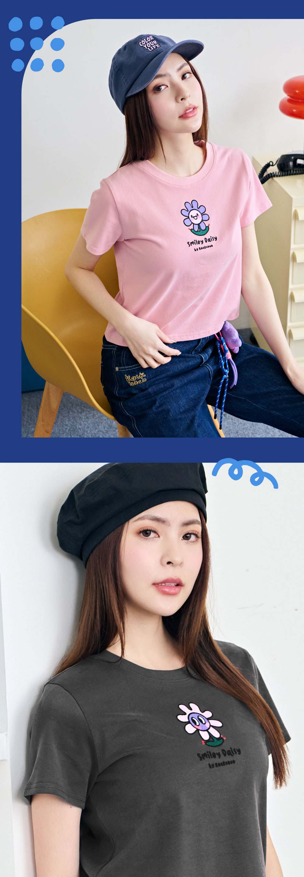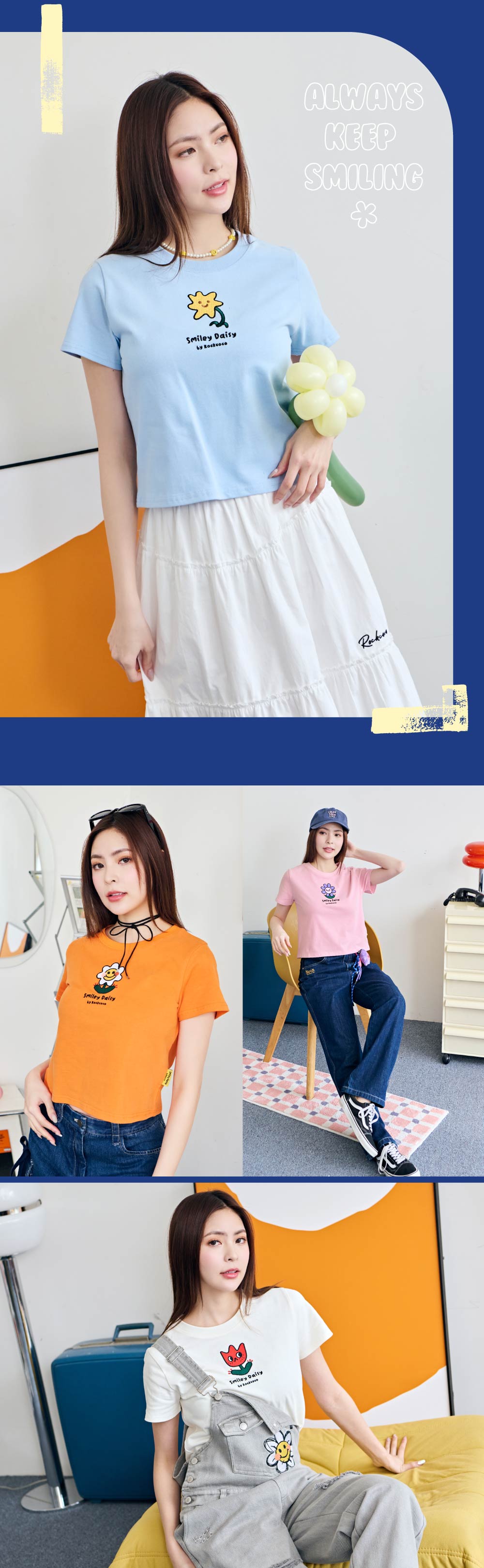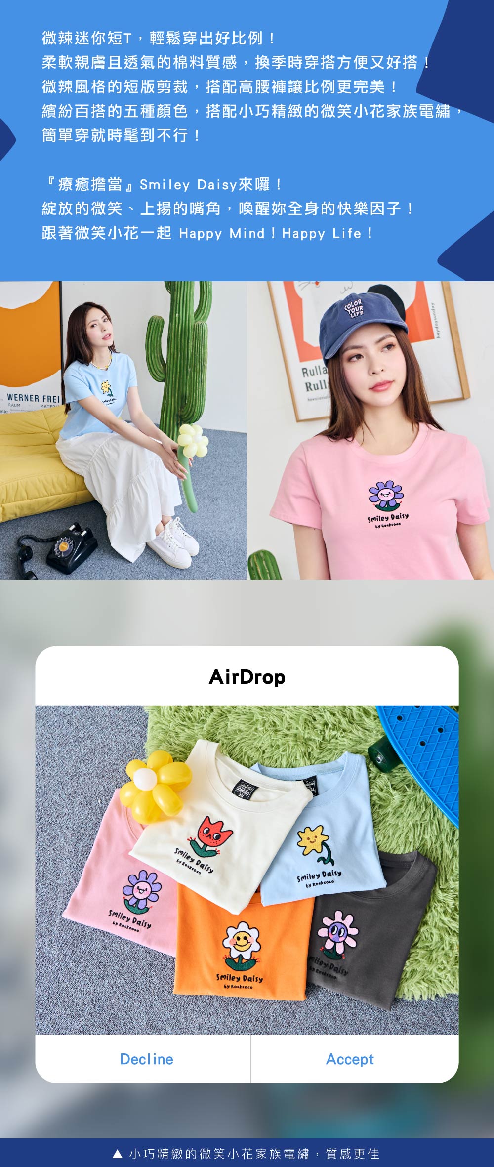 柔軟親膚且透氣的棉料質感,換季時穿搭方便又好搭!微辣風格的短版剪裁,搭配高腰褲讓比例更完美!繽紛百搭的五種顏色,搭配小巧精緻的微笑小花家族電繡,簡單穿就時髦到不行